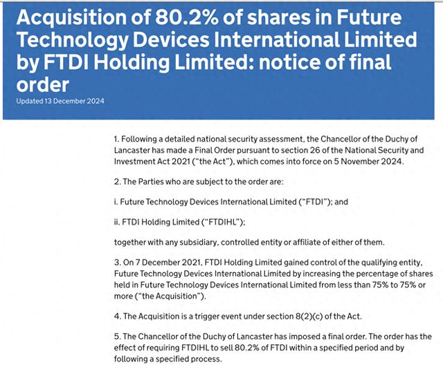 然而不到三年,這一交易卻遭遇挫折。2024年11月5日,英國政府突然依據(jù)《2021年國家安全與投資法》(NISA)中的“回溯審查”條款,對這項收購發(fā)起追溯審查,并發(fā)布最終命令通知,要求FTDI Holding Ltd在限定時間內(nèi)出售其持有的FTDI全部80.2%的股權(quán),理由是存在國家安全風(fēng)險。
